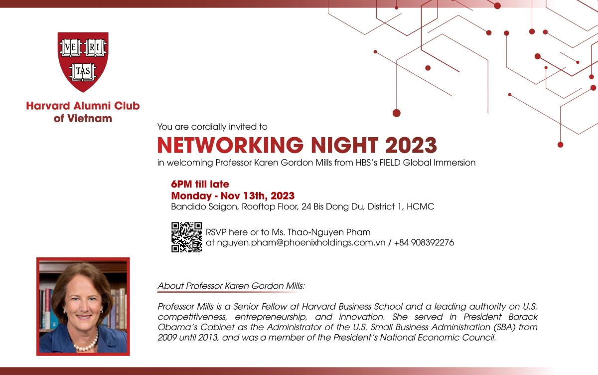 Dear Harvard Alumni in Vietnam, We are delighted to invite you to our Harvard Networking Night, taking place at Bandido Saigon, 24 Bis Dong Du, District 1, HCMC, on Monday, November 13, 2023, at 6:00 PM.
