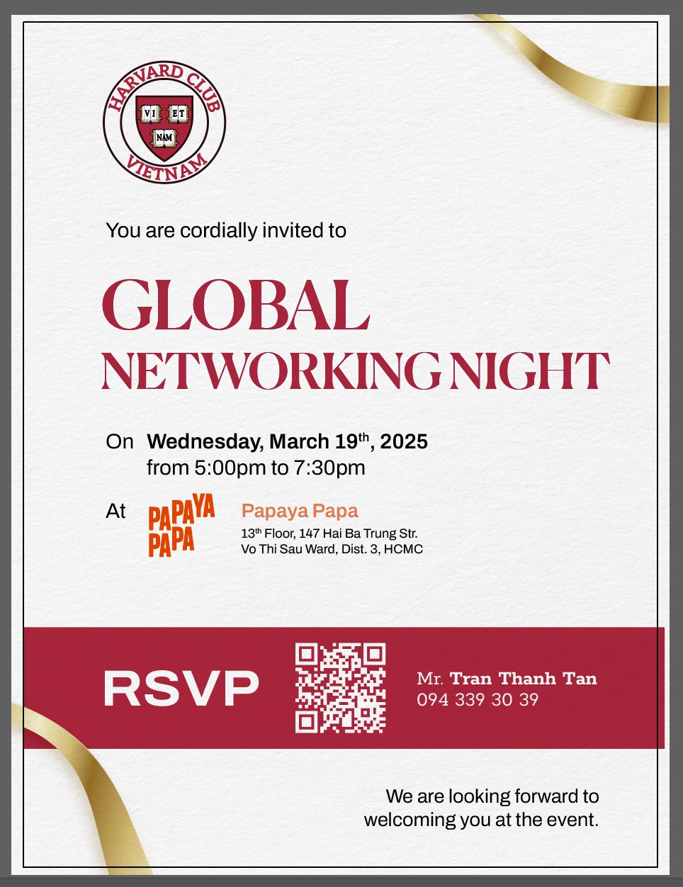 Dear Harvard Alumni in Vietnam, We are delighted to invite you to the Harvard Global Networking Night 2025, a special event designed to bring together our vibrant alumni community worldwide.